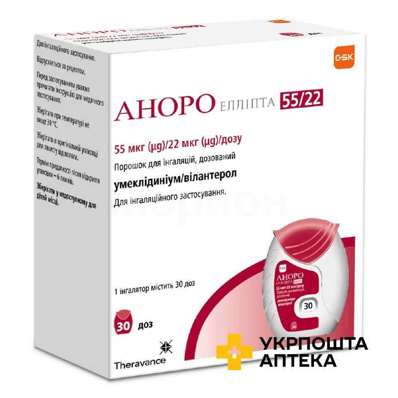 Аноро елліпта пор. д/інг. 22 мкг/доза + 55 мкг/доза 30.доз Глаксо Оперейшнс ЮК (Великобританія)